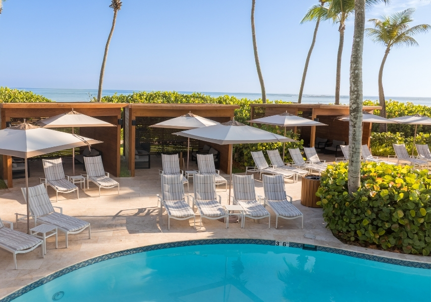 The Aura Swim Lounge at Rio Mar Resort is an adults-only, tropical retreat offering six luxury cabanas near the water. Surrounded by lush greenery, it’s a serene spot for relaxation, with elevated service including juices, rosé, and cocktails—perfect for unwinding in style.