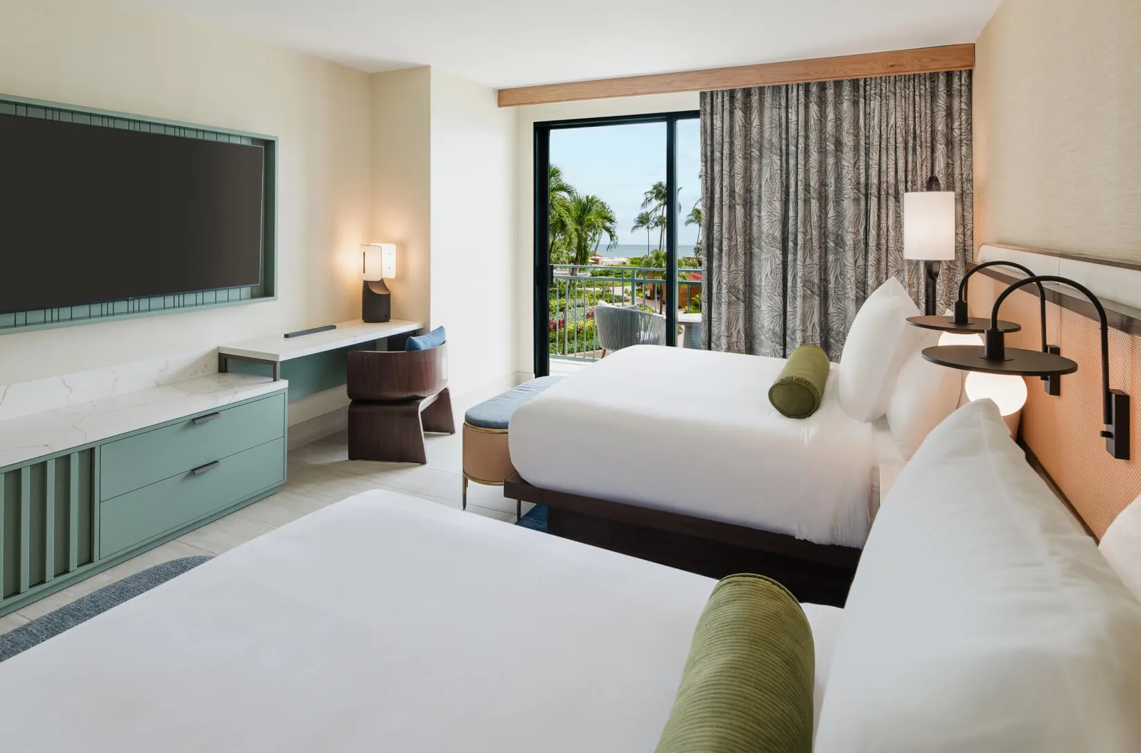 From your private balcony, soak up the lively yet relaxed atmosphere before retreating to two cozy queen beds. Overlook a sun-drenched oasis where palm trees sway and crystal-clear waters invite you in. Here, poolside paradise is always within reach.