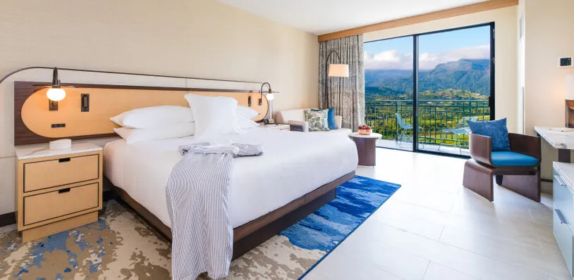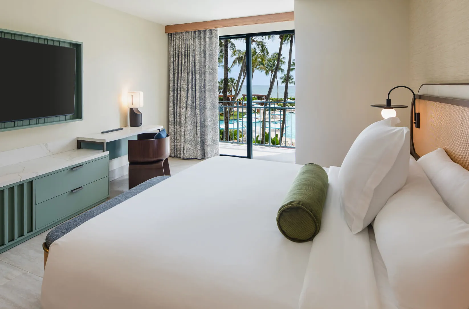 A relaxing escape overlooking sunlit pools and swaying palms. This inviting room features a plush king bed, modern touches, and a private balcony—perfect for soaking in the vibrant energy of the resort.
